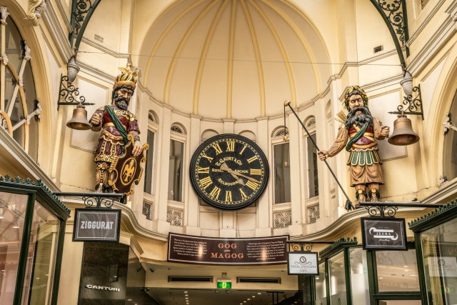 バーク・ストリートとリトルコリンズ・ストリートを結ぶロイヤルアーケードは1870年の建造とメルボルン最古。カフェやファッションから魔法グッズやお土産などショップも魅力的。入り口奥にある時計が名所になっています。