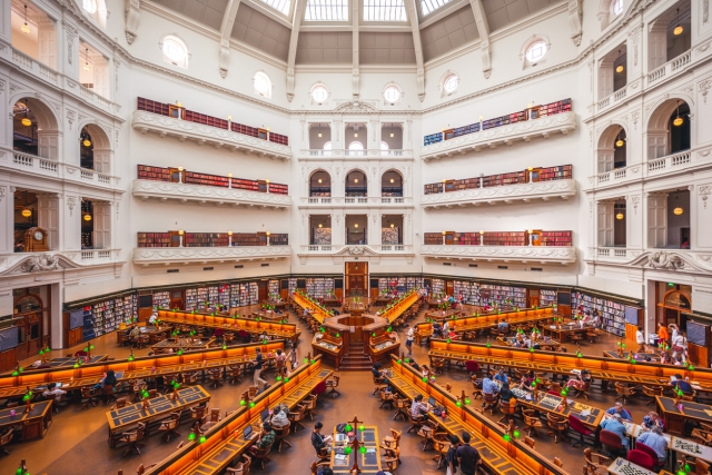 ビクトリア時代の建物では、ビクトリア州立図書館も忘れてはいけません。机が放射状に配置されたラトローブ・リーディングルームは息を飲む美しさで、「死ぬまでに行きたい世界の図書館」に選ばれたことも。ビジターでも本が読め、Wi-Fiやカフェがあり、定期的に展示も開催されるので立ち寄って損はない無料スポットです。