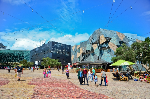 観光のスタート地点にしたいのはフェデレーションスクエア。郊外への起点となるフリンダースストリート駅のそばで、東西南北どちら方面のトラムにも乗りやすいポイントです。オーストラリアのアートを展示するイアンポッター・センター(NGVオーストラリア)や映像センターACMIがあるほか、毎日のさまざまなイベントが行われ、ミーティングスポットになっています。ビジターセンターのメルボルンビジターハブもここから北に500mほど。