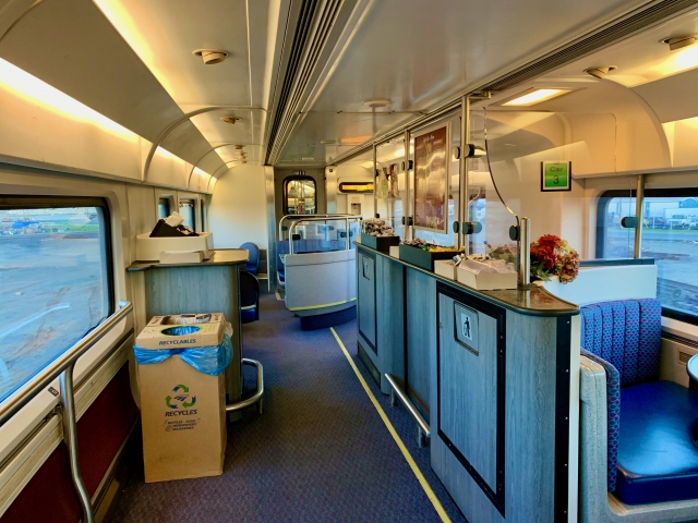 朝日を眺めながらコーヒータイム(1杯$2)を楽しみましょう。進行方向左側は広陵とした畑、右側は畑の向こうに丘陵地帯が延々と続きます。アムトラック・サンワキンルートは、食べ物は車内で購入してもらうようになっているので、あからさまにお弁当を広げるのはつつしんでくださいね。スナック程度なら大丈夫です。