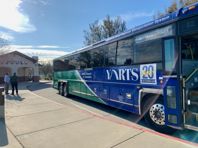 8時45分、マーセッド駅に到着。駅のそばから9時10分発、ヨセミテ国立公園行きのヤーツバス(YARTS bus#8402/Run4)に乗り換えます。マーセッド駅では、ロサンゼルス方面から来るアムトラックとも接続するので、多少出発時間が遅れることがありますが、乗っていた列車が遅れても決してバスは先に出発しません。そしてバスに乗車の際は、切符の確認がありますので、時前にスクリーンショットなどして用意しておきましょう。
