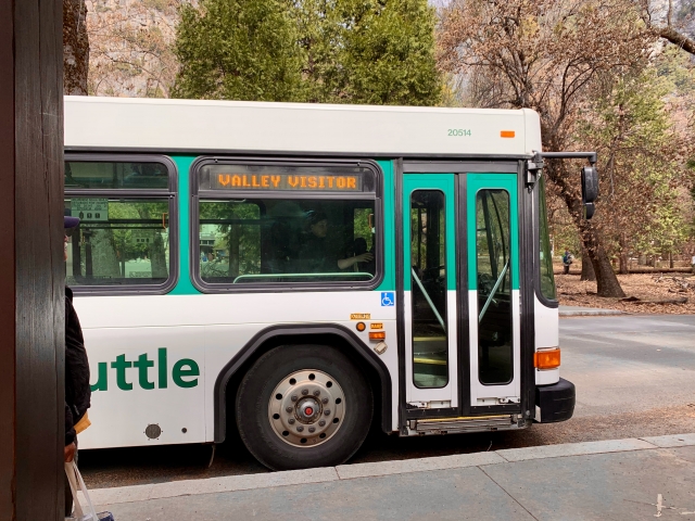 この日は、まだハイシーズンではなかったので混雑していませんでした。ヨセミテバレーを回るのは公園内を無料で運行している「ヨセミテバレーシャトル(Yosemite Valley Shuttle/バレーシャトル)」がおすすめです。15分ごとに回っているので時間も読めますし、ドライバーさんから簡単な情報収集も可能です。