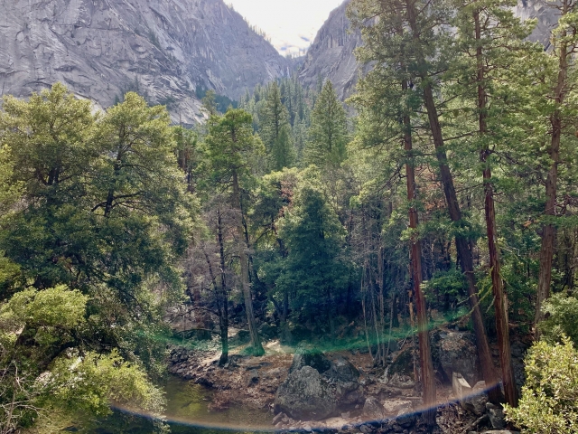 歩き始めて45分ほどで、目的地の「バーナル滝(Vernal Fall)/落差97m」が見えました。この滝はグレーシャーポイント(冬場は閉鎖)からの遠景でしか見たことがなく、近くで見ると横に広がった滝だったのでヨセミテにしては珍しい滝のように感じました。