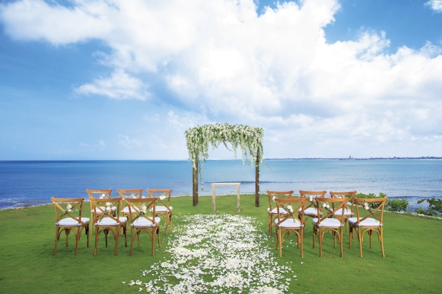 THE RITZ-CARLTON BALI The Majestic Chapel(ザ・リッツ・カールトン バリ ザ・マジェスティックチャペル)は、最高級ホテル ザ・リッツ・カールトン バリに凛とたたずんでいます。ふたつのアーチがひとつに重なり合うフォルムは新郎新婦の人生がひとつに重なり合い、共に歩んでいくことを表現しています。祭壇に立つと、天井は高く開放感にあふれ、眼前に広がるのは壮大なインド洋のパノラマ。挙式後は目の前のビーチでの写真撮影が定番です。