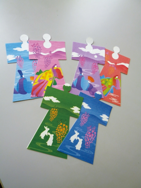 宇治上神社は授与品が多彩なことでも評判です。そのひとつが「人形(ひとがた)」というカラフルな紙。氏名と願いごとを書いて納めると、それがかなうよう神前に置いて祈願してもらうことができます(500円)。このほか、人形に負けないくらいカラフルな厄除けお守り(500円)や、主祭神の名にちなんだ「うさぎのおみくじ」(300円)もあります。