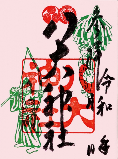 八大神社では、通常御朱印のほか、季節ごとの祭礼の様子を表すイラストが描かれた期間限定の「彩り御朱印」(各300円)が頒布されています。春の彩り御朱印は、毎年3~5月限定で授与されるもので、4月に執り行われる弓執り神事「神弓祭」と、5月5日の大祭に参加する踊子ホウキを持った「サンヨレ踊り子」が華やかなピンクの地に描かれています。気持ちがぱっと浮き立つような、カラフルな御朱印ですね!ちなみに、夏は水色、秋はオレンジ、冬は純白と、それぞれ季節感たっぷりの彩り御朱印が用意されていますので、ぜひ一年を通してお参りしてみてください。