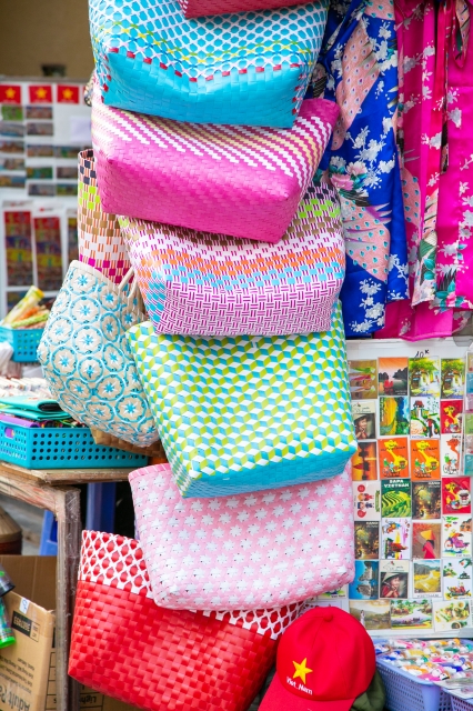 カラフルなプラスチックバンドを編み込んで作るプラカゴは、市場などで日常的に使われるシンプルなものから、さまざまな模様に編み込まれた芸術性の高いものまであり、目移りしてしまいます。