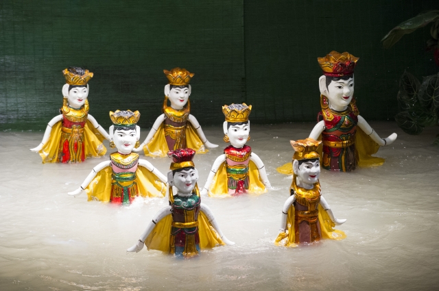 水面を舞台に繰り広げられる水上人形劇はベトナムの伝統芸能です。民話、習慣、伝統に基づいた短編が、伝統楽器の調べにのせて、人形によってテンポよく綴られていきます。1956年、ホーチミンによって建てられたタンロン水上人形劇場では毎日6回上演されています。