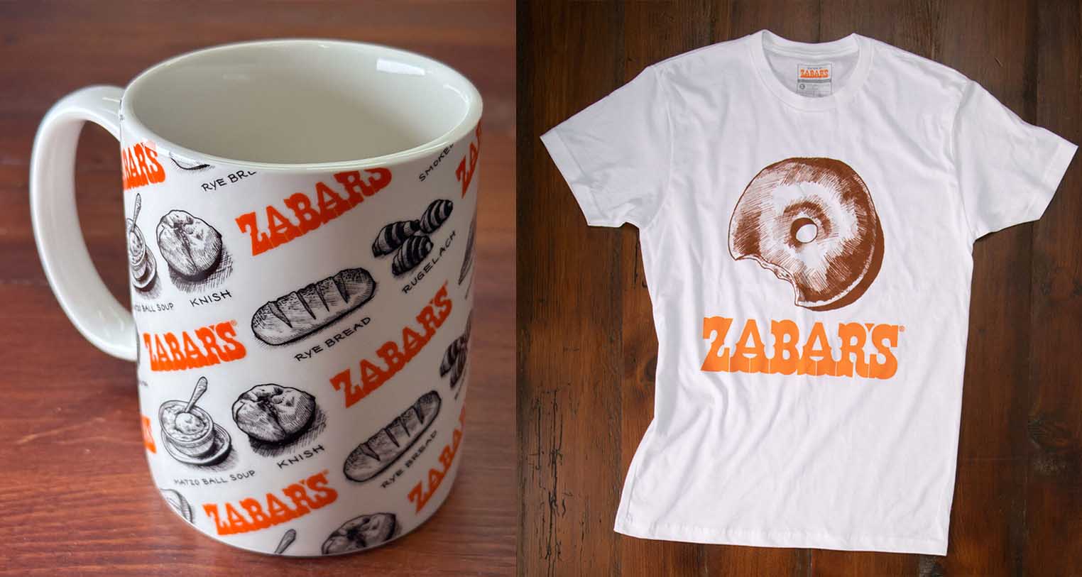 チーズやお総菜、コーヒーなど対面販売のカウンターが多く、いつも活気あふれる老舗高級グルメストア。人気のロゴ入りグッズのなかから、コーヒーがおいしく楽しめそうなマグとTシャツをチョイス。歴史とあたたかみを感じるデザインがすてきです。