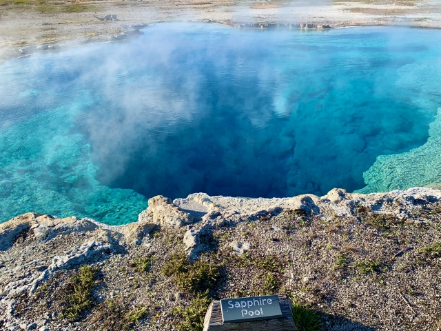 散策中、突如ドドドッ!と地響きがして、少し地面が揺れました。地震の初期微動だと思い慌てて頭を押さえ身構えたのですが、園の係りの方が「スティーム・ボート・間欠泉(Steamboat Geyser)」方向を確認して、通常の仕事に戻っていました。あとでわかったことですが、噴出時間データに載る規模の噴出が起こっていたそう。園内には、1日数回温水を噴出するガイザーがさまざまなところにあり、目の前で突然噴出が始まることもあります。頭から熱水を被って大火傷しないか!? 心配で足がすくんで動けないこともありました。