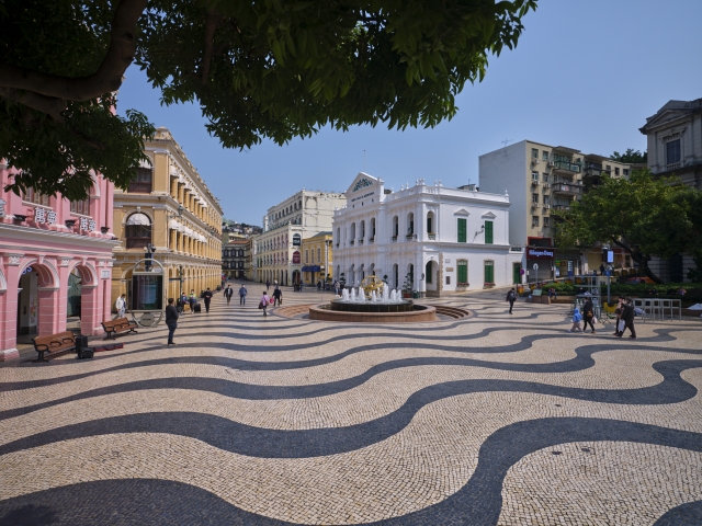 そして、街の中心となるセナド広場へ。波模様の石畳が敷き詰められ、噴水の中央には天球儀が。市民、観光客も多く行きかうこの広場も世界遺産。そのすぐ真向かいにあるのが、民政総署(現 市政署)。ポルトガル統治時代の中枢として設立し、現在も市民生活を司る政府機関として機能しています。ポルトガルのマフラ宮殿内図書館を模した重厚な雰囲気の図書館やポルトガル伝統のタイル、アズレージョも美しいですね。
