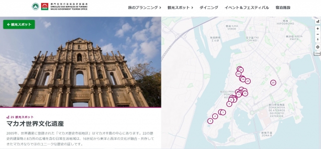 マカオの魅力は、人々の生活を身近に感じながら街を歩き、多くの世界遺産に触れられること。マカオ政府観光局のウェブサイトには、地図と連動した世界遺産など見どころ紹介のページもあり、位置や距離感を把握するのにも便利です。
