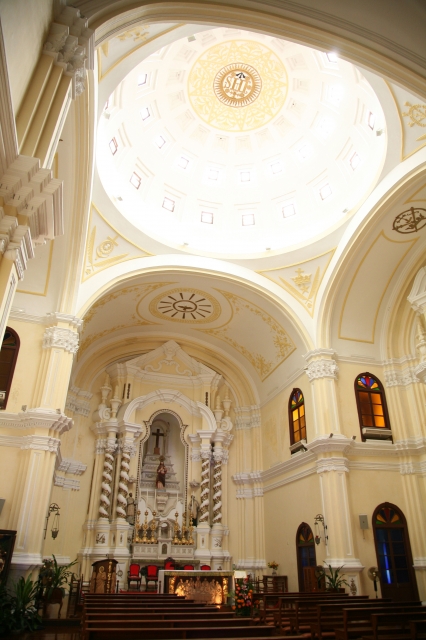 次の演奏ステージは聖ヨセフ修道院及び聖堂。ここはイエズス会宣教師の育成を目的として建てられた。ドーム型の天井やねじれた柱も特徴的。ここには日本に初めてキリスト教を伝えた聖フランシスコ・ザビエルの遺骨も安置されています。また、最も古い教会の一つと言われる聖ローレンス教会。現在は1800年代に再建されたものですが、内部のシャンデリアやステンドグラスなどの装飾がとても優美。マカオの多くの教会の外壁はクリームイエローなどのパステルカラーで、優しい感じがとても印象に残ります。