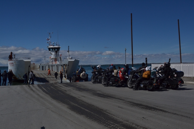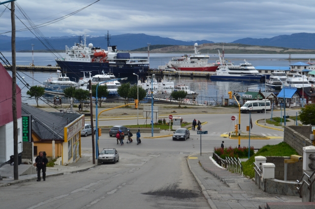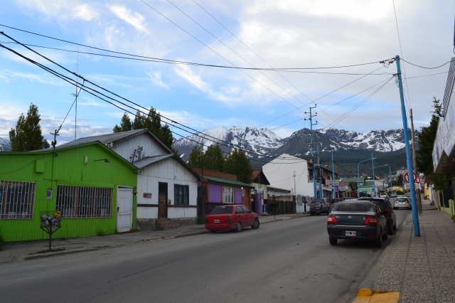 3時間ほどでフエゴ島に渡る地点に到着しました。道路が水の中に突っ込んでいる奇妙な風景。程なくしてカーフェリーが到着し、大型車が上陸したのち、我々バスの乗客は下車して徒歩で乗船しました。10分ほどでフエゴ島側に上陸。バスに乗り込み、何事もなかったかのようにウシュアイアへ向けて再出発となりました。バスはくねくねと山沿いの道路を進み、山を抜けた頃にウシュアイアの町が見えてきました。