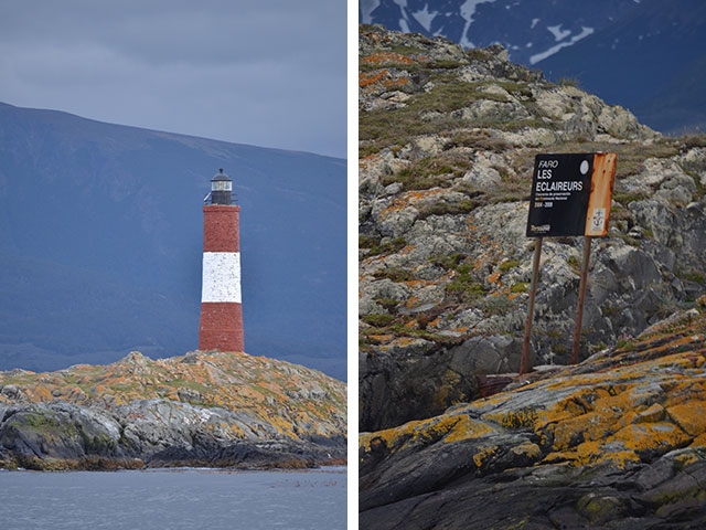 日没がかなり遅いため、ツアーは19時30分にスタートしました。参加者は20名程度。船内でガイドさんが地図を広げ、ツアールートの説明をしてくれます。船は海鳥が羽を休め、オタリアがゴロゴロと寝そべっている岩場に接近してくれるので、写真撮り放題です。海鳥やオタリアをアップで撮影できるので、望遠レンズを持って行っていてよかったと思いました。いよいよ、この旅行最大の目的であるエクレルール灯台Faro Les Eclaireursが見えてきました。長い道のりでしたが、ようやくたどり着くことができました。