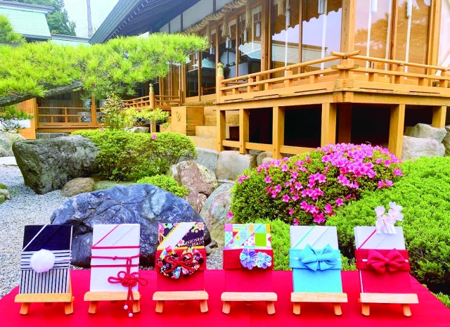 授与品が充実していることも、天之宮神社の魅力のひとつ。こちらは、神職と宮人がデザイン~制作のすべてを手掛けている、立体の「オリジナル御朱印帳」(各2500~1万円)。写真左から、紋付き袴、白無垢、卒業袴黒、卒業袴青、神職浅葱袴、巫女袴をモチーフに作られたものです。卒業の記念、あるいは結婚の節目などに頂いていきたいすてきなデザインですね。