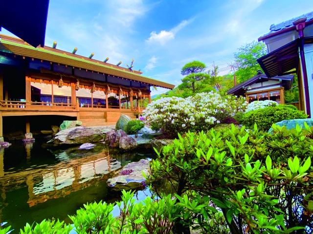 天之宮神社の御祭神は、天然元津大神、春夏秋冬大神、天自然大神。自然を神とあがめ、その偉大さに畏怖の念を抱く「自然信仰」を今に伝えています。いたるところに花が咲き、川が流れ、まるで水と本殿が一体化したかのような境内はたいへん美しく、必見です。御朱印の絵柄が2ヵ月ごとに変わるように、季節の花々も移ろい、参拝者の心を楽しませてくれます。