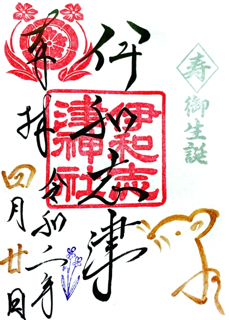 宝塚随一の古社・伊和志津神社は、若い神職が次々と新しい試みを仕掛ける話題の神社。2019年から御朱印に力を入れ、魅力的なデザインの印を続々繰り出しています。こちらでぜひ頂きたいのは、誕生日御朱印! 「自分が生まれたことの喜びを感じてほしい」「参拝者の大切な日を一緒にお祝いしたい」という思いで企画されたものだそう。右下にはその年の干支が金色で描かれ、授与日の日付も入れてもらえるので、ぜひ誕生日当日に授与いただきたいですね。