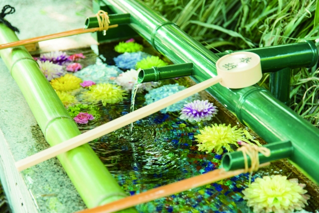 伊和志津神社の境内には、参拝者の心を和ませるさまざまな工夫が施されています。そのひとつが、季節の花々を美しくあしらった花手水。あるときは可憐な野花、またあるときは、宝塚市が全国の出荷量の4分の1を占めるというダリアが水面に彩りを添えています。