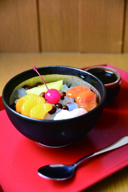 創業の翌年に、しんこ餅に赤えんどう豆をのせたものをヒントに、角寒天、甘煮杏、求肥などを盛って蜜をかけた現在のみつ豆を提供し、「みつ豆ホール」として名をはせていたとか。甘い蜜と、赤えんどう豆の塩味が絶妙な調和を生み、今でも多くのファンを虜にしています。