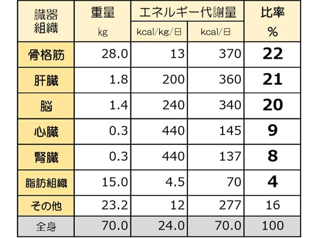 曽川さん:そうですね。よく、「30過ぎたら代謝が落ちるから、気をつけないと」と耳にするかと思いますが、実は基礎代謝量のピークは男女とも10代後半で、以降は右肩下がりに低下していきますが、その下がり方は、日常的に運動習慣のある人では緩やかであるといわれています。反対に、暴飲暴食や運動不足などがあると、急減するとも言われていますから、20代の方も油断せず、代謝が急に下がらぬよう、適度な運動の継続を意識して頂ければと思います。上の表を参照してください。単独の部位で言うと、人間の体で一番代謝量が多いのは肝臓で、以下、脳、心臓、腎臓と続きます。しかし、これらの臓器は「鍛える」わけにはいきません。では、どこの代謝を上げるのか?「骨格筋」です。簡単に言うと、骨格筋とは骨格に付着した、姿勢を維持したり、体を動かす筋肉です。皆さんが「筋肉」と聞いてイメージする腹筋・背筋、腕や足の筋肉と考えればわかりやすいかと思います。この骨格筋が一番多いのが、下肢であり、その中でも太腿になります。従って、負荷をかけた特別なトレーニングでなくても、無意識のうちにその筋肉を使う「歩く」という運動が有効と言えます。