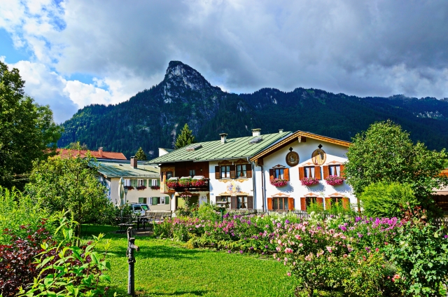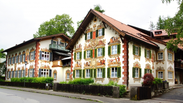 ドイツ南部、オーストリアとの国境にほど近い場所にあるオーバーアマガウは、ミュンヘンから鉄道で約1時間50分。村の中心地から南に伸びるエッタール通りを歩いて行くと、『赤ずきん』や『ヘンゼルとグレーテル』などのグリム童話のフレスコ画が描かれた民家が建ち並びます。緑に囲まれたこぢんまりとした田舎の村に鮮やかな壁画という意外性が楽しめます。