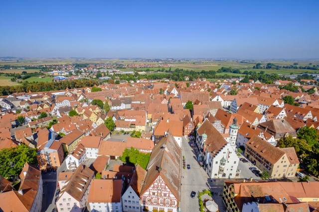 ミュンヘンからネルトリンゲンまでは、鉄道で約1時間30分。ネルトリンゲンは旧市街のまわりをぐるりと城壁に囲まれた城塞都市。空撮写真で見ると、きれいな円形をしています。なんと、1500万年前の隕石落下によってできた“リース盆地”の中に町が形成されているという珍しい町なんです。