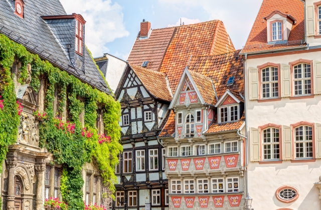クヴェトリンブルクの魅力は、どこを歩いても、かわいらしい木組みの建築に出合えること。それぞれ違う特徴をもつ家の外観を見て楽しみながら、あちこち散策するのが楽しい町です。小高い丘の上に建つ「城山(シュロスベルク)」から見渡す絶景の町並みも必見。また、木組みの家を利用したホテルに宿泊するのもすばらしい思い出になるはず!