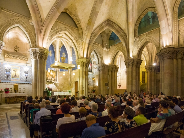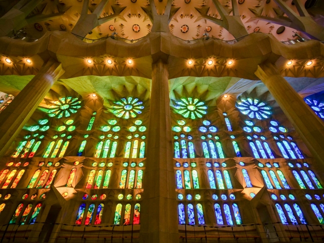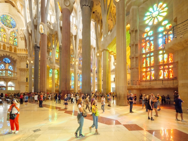 ガウディの設計案に基づいて建設され、2010年に完成。樹木のように枝分かれした柱がヴォールト天井を支え、天井は殉教のシンボルであるシュロの葉のモチーフで飾られています。また、色鮮やかなステンドグラスにも注目。東側は赤やオレンジの暖色、西側は青や緑の寒色を基調とし、太陽が差し込む方角によってさまざまな表情を見せてくれます。