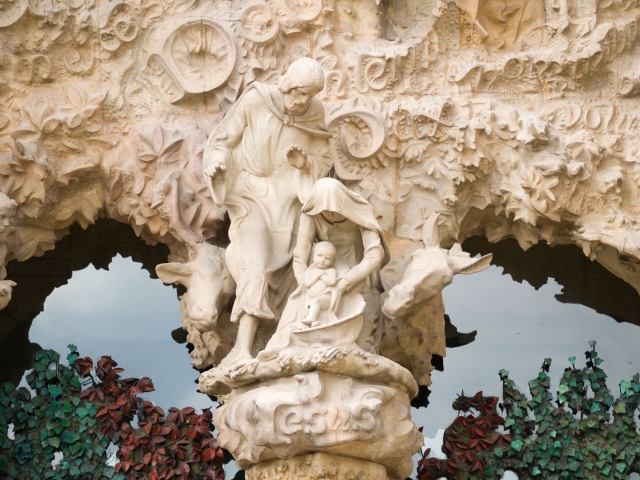 太陽が昇る東側に面したファサードには、イエスの誕生から幼少期までの出来事が表現されています。ガウディ自らが指揮をとって制作した見事な彫刻は、聖堂のなかでも最大の見どころといえるでしょう。