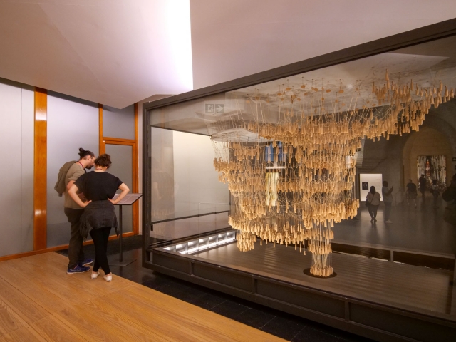 聖堂の地下に博物館があり、ガウディが残したスケッチや模型などが展示されています。なかでも有名なのが、フニクラ(Funicular)と呼ばれる「逆さ吊り模型」。ガウディはこの模型を使った実験を10年間も行い、ヒモに重りを吊り下げてできる曲線を上下反転したものが、自然で丈夫な建築構造であると考えたのです。