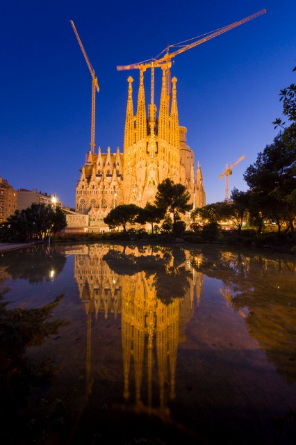 時間があれば、夜のサグラダ・ファミリアもぜひ訪れてみましょう。日没後にライトアップされ、昼間とはまた違った幻想的で美しい姿を見せてくれます。写真を撮影するなら、生誕のファサード側にあるガウディ広場(Plaça de Gaudí)がおすすめ。池に映った「逆さサグラダ・ファミリア」を見られます。