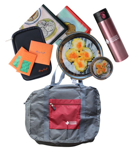 2. 折り畳みガーメントバッグやトラベルポーチ、マスクケース、香港の食モチーフのハンカチといった旅行関連グッズ入りの、香港政府観光局特製オリジナル トラベルパック 10名