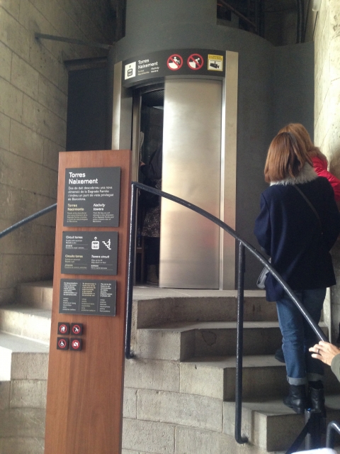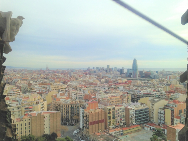 いよいよ、塔(鐘楼)の上へ昇るエレベーターに乗り込みます! 数人しか乗れない狭いエレベーターから降りると外気にさらされ、つづけて最上部へ向かう狭い階段へ。螺旋状に上がっていくため、バルセロナの街をぐるりと眺められます。いちばん気持ちのよい眺めは、バルセロネータ海岸が遠くに見える南東方向だと思います!