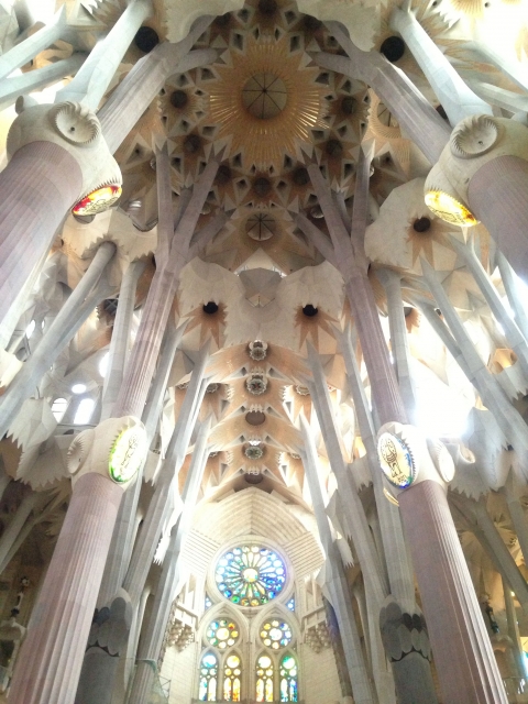 入場チケットチェックを通過して聖堂の内部へと進むと、神々しく優美な空間に包まれ、一瞬で心が清められていくような気持ちに。樹木のように並んだいくつもの柱が、シュロの葉をモチーフにした天井へと伸び、その隙間から柔らかな陽の光が差し込むさまは、まるで木漏れ日きらめく森の中。しばらく我を忘れて、うっとりしてしまいます。そして、ここは現役の教会であり、十字架磔刑のキリスト像を頂く祭壇もあって、一心に祈りをささげる人の姿も。そんな信徒の邪魔をしないよう、そおっと歩いて、見事なステンドグラスを眺めて回ります。