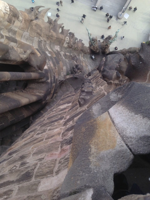 聖堂を出て尖塔を昇るエレベーターへ向かう前に、「生誕のファサード」を愛でることにします。巨大な石の門に、キリストの生誕から幼少期の出来事が彫刻で表現されており、よくもこんなに精巧に彫り込んだなぁ、と感心するばかり。なかでも特に注目したいのは、日本人彫刻家の外尾悦郎さんが制作した、15体の天使像。それから足元にも目を落としてみてください。太い柱を、大きなカメがしっかり支えています。このカメさんは、装飾としてだけではなく、雨どいとしての役割も果たしているそうです。こんなところからも、機能性とデザイン性を融合させる名建築家ガウディの才能を実感できます。
