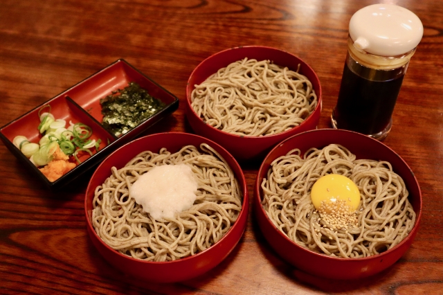 「荒木屋」では、香り豊かな素朴な味わいのそばを、卵やとろろ、なめこおろしなどさまざまな薬味がのった3〜5段の割子そばメニューで楽しめます。