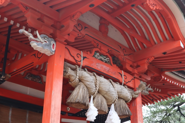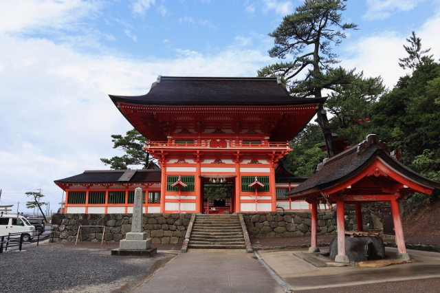 島根半島の西端に位置し、日本海を背に鎮座する鮮やかな朱色の神社はまるで竜宮城のよう。境内の本殿や拝殿、廻廊、石造建造物などは、貴重な神社建築として国の重要文化財に指定されています。