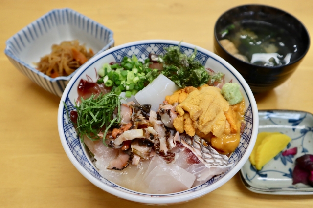 おすすめは、数種の旬の魚と、サザエの刺身、ウニが贅沢にのった「古事記ウニ入り丼(2200円)」。この日は、ヒラマサやタイ、カジキマグロ、白イカがラインナップし、どれも厚めに切られていて食べ応え十分です。