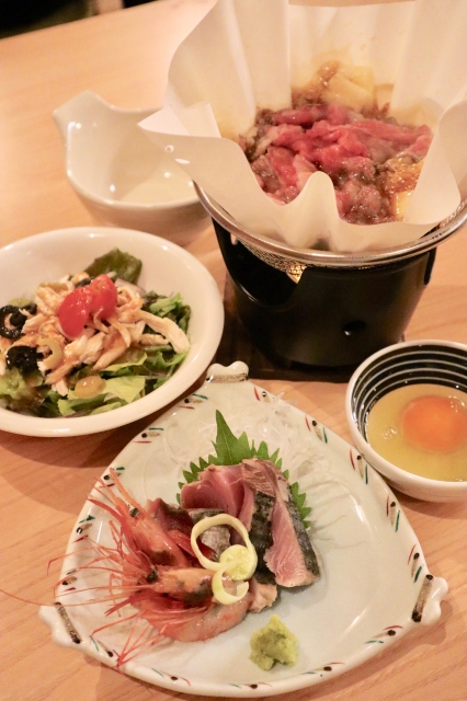 メニューは、刺身や天ぷらなどの和食から、牛肉やワイン煮込みや魚のソテーなどの洋風アレンジまで種類豊富。いろんな料理を少しずつ食べたい人には、「本日のおまかせコース(3500円〜)」がおすすめです。手作りのおばんざいや、地魚のお造り、島根和牛のすき焼きやステーキがセットになってコスパも◎。島根の地酒も豊富にそろうので、おいしい食事とともに楽しい松江の夜が過ごせます。