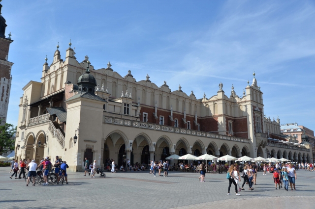 中央広場の中心に建つルネッサンス様式の堂々たる建物で、14世紀には衣類や布地の交易所として利用されていたことから、この名になりました。2階にはポーランドの国内美術品が一堂に会すクラクフ国立美術館、地下には最新のコンピューター技術でクラクフの歴史を解説する地下博物館が入っています。1階はお土産店が並ぶショッピングアーケードや老舗カフェが入っていて、いろいろと楽しむことができます。