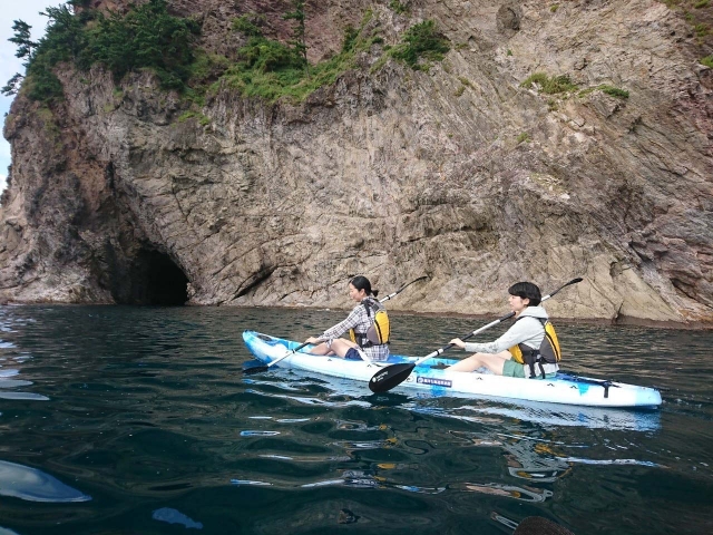 シーカヤックの魅力は、船では行けない岩のそばまで近づけるので、ワイルドな岩壁や洞窟を間近に見学できること。また水面が近いので、透明度の高い海の上を滑るように進んでいけるのもほかではなかなかできない体験です。エンジン音がないので、静かにゆったり自然と向き合えるのもいいですね。