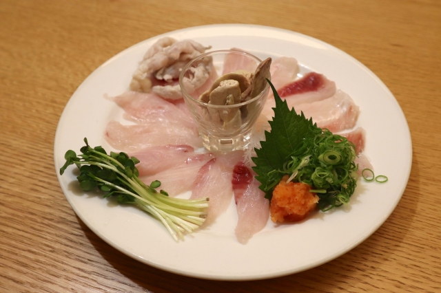 メニューを見ると、隠岐島名産のバイ貝を使った名物のバイフライから海鮮ちらし、うどんまでバラエティ豊か。定番メニューも魅力的ですが、まずは黒板メニューをチェックするのを忘れずに。ノドクロや岩カキ、アワビなど、旬の日本海の幸がずらりと揃い、声をかければカウンターに並ぶ魚介を見ながら店主が相談にのってくれます。これらは注文すると、部位ごとに、刺身や天ぷら、煮つけ、寿司など、おすすめの料理に調理してくれるので、ひとつの魚介でいろいろな味を楽しめるのがうれしいかぎり。