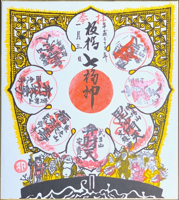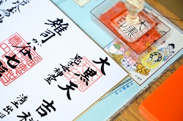 神様・仏様の参拝が済んだらいざ、御朱印を頂きます。七福神の場合、多くの寺社で色紙の用意があるので、最初に訪れた寺社の寺務所や社務所で「七福神めぐりの色紙を頂けますか」と伝えてみてください。色紙の形式は七福神によって実にさまざま。通常の御朱印のように墨書と朱印が頂ける場合や、七福神名は色紙に印刷されていて朱印のみ自分で押す場合、七福神のイラストが朱印になっている場合など…… 毎年めぐって違いを楽しんでみるのもいいですね。