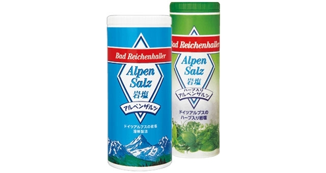 きっと誰もが一度は目にしたことがある青いパッケージの「アルペンザルツ」。ドイツで人気ナンバーワンを誇る岩塩で、ドイツアルプス山脈の2億5千万年前に形成された岩塩層から採取されました。カルシウムが豊富に含まれ(400mg / 100g中)、まろやかでコクのある味わいは、素材本来のおいしさを引き立てます。青いドラムが「アルペンザルツ」、緑のドラムが10種類の天然ハーブを使用した「ハーブ入りアルペンザルツ」。他の調味料との相性も抜群です!