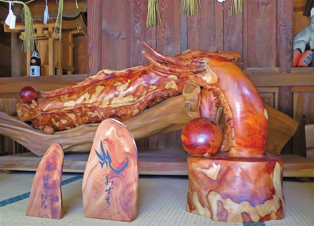縣主神社の社殿には、龍神様となった蛇(ミズチ)の木像が祀られています。イチイの木に彫り込まれた像を拝めば、粘り強さのパワーと金運の御利益があるといわれています。