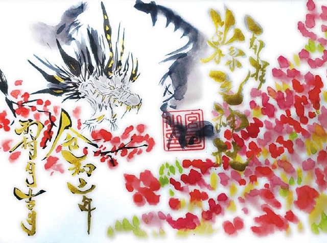 全国的に評判の絵入り御朱印は、月替わりで3種類の中から一体を頂けます。描かれているのは、神社に住み着いているネコ、雛人形などの四季折々の風物詩、そして伝説の大蛇ミズチの3テーマ。見開きで描かれるカラフルな御朱印(1000円)は、すべて彩色や表情が異なるオンリーワンの特別な御朱印です。