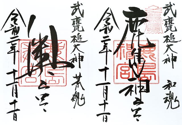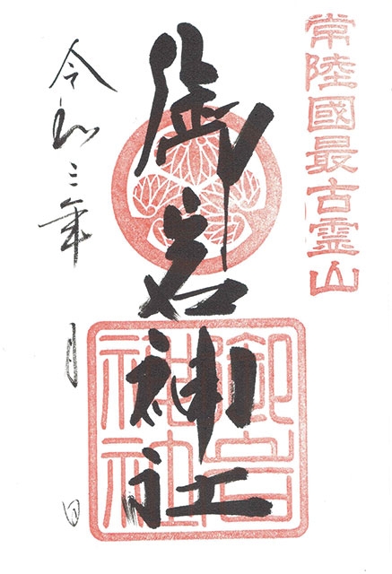 御朱印は参拝後に社務所で頂きましょう。中央に押される社紋(三つ葉葵紋)は、御岩神社が徳川御三家の水戸藩の祈願所だったことを示しています。奥宮の「かびれ神宮」の御朱印も頂けます。かびれ神宮の御朱印に押印されるのは十六菊花紋の印です。