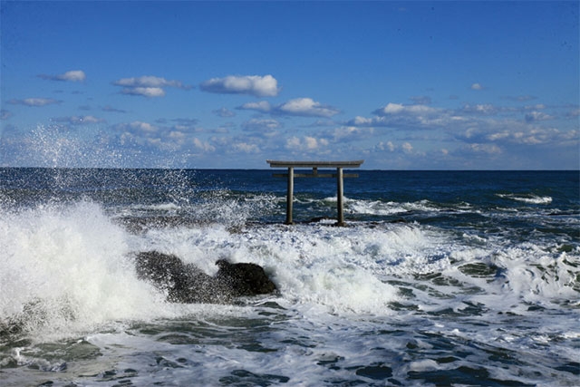 「大洗磯前」という神社名のとおり、大洗海岸を望む小高い場所に鎮座する神社です。海上の岩礁に立つ「神磯の鳥居」が有名で、多くの人が写真を撮りに訪れます。鳥居があるのは、二之鳥居から道路を挟んだ先に広がる神磯と呼ばれる太平洋に臨む磯辺。地震や噴火、流行り病などに苦しむ人々を救うために神様が降臨したと伝わる聖地です。写真を撮るだけではなく、心静かにお参りすることも忘れずに。