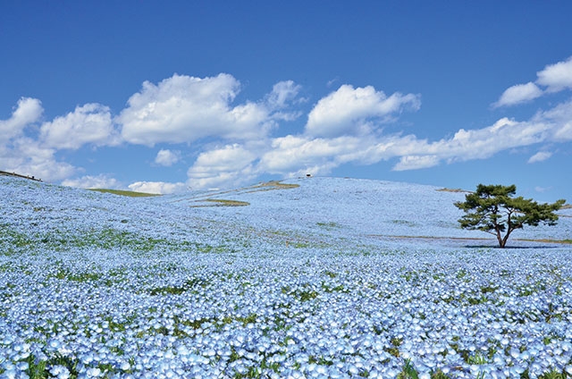 大洗磯前神社を参拝したあとは、神社から車で約25分の「国営ひたち海浜公園」へ。1年をとおして色とりどりの草花が楽しめる人気の公園で、4月中旬~5月上旬は広大な「みはらしの丘」に約530万本のネモフィラが咲き誇ります。丘が見渡す限りブルーに染まる景色は息をのむ美しさです。